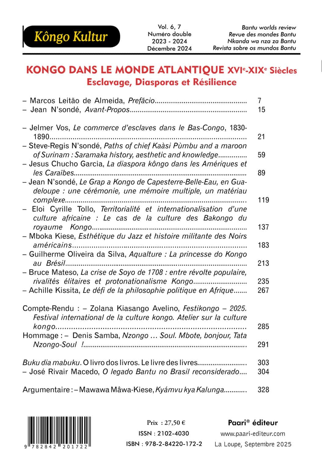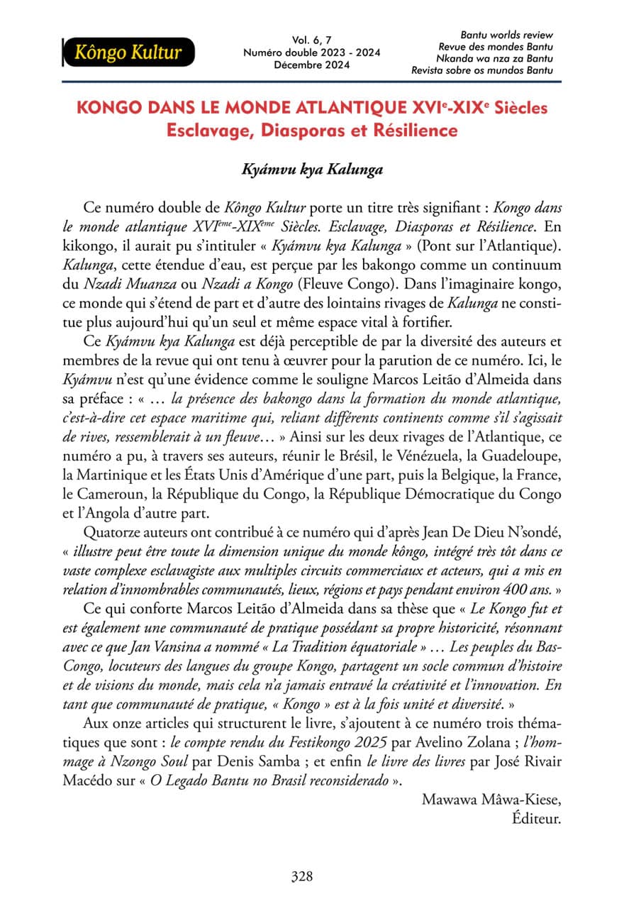 Aux onze articles qui structurent le livre, s’ajoutent à ce numéro trois thématiques que sont : le compte rendu du Festikongo 2025 par Avelino Zolana ; l’hommage à Nzongo Soul par Denis Samba ; et enfin le livre des livres par José Rivair Macédo sur « O Legado Bantu no Brasil reconsiderado ».