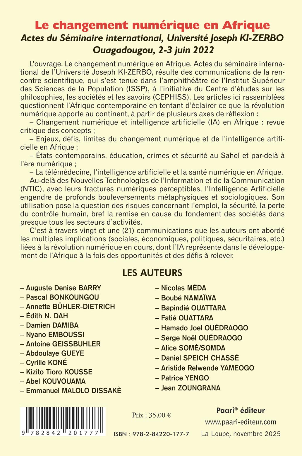 L’ouvrage, Le changement numérique en Afrique. Actes du séminaire international de l’Université Joseph KI-ZERBO, résulte des communications de la rencontre scientifique, qui s’est tenue dans l’amphithéâtre de l’Institut Supérieur des Sciences de la Population (ISSP), à l’initiative du Centre d’études sur les philosophies, les sociétés et les savoirs (CEPHISS). Les articles ici rassemblées questionnent l’Afrique contemporaine en tentant d’éclairer ce que la révolution numérique apporte au continent, à partir de plusieurs axes de réflexion :